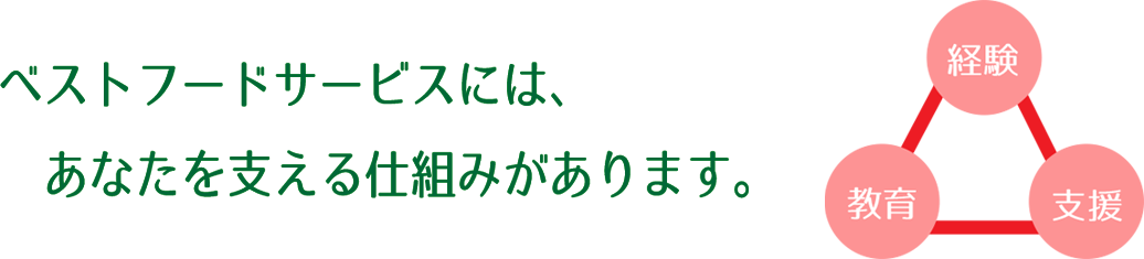 ベストフードサービスでは入社1年目を教育期間とし教育研修を行います。入社6ヶ月の研修期間で基本的な業務内容について習得できるので自信を持って実務にあたれます。