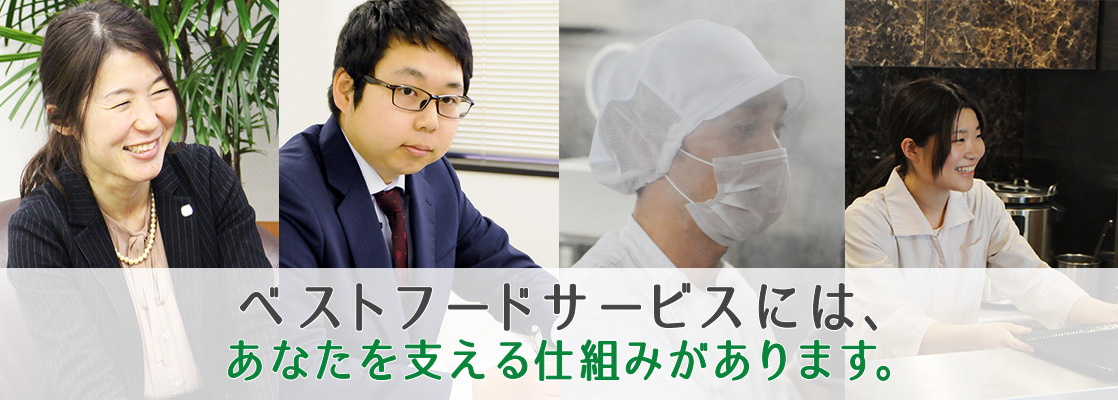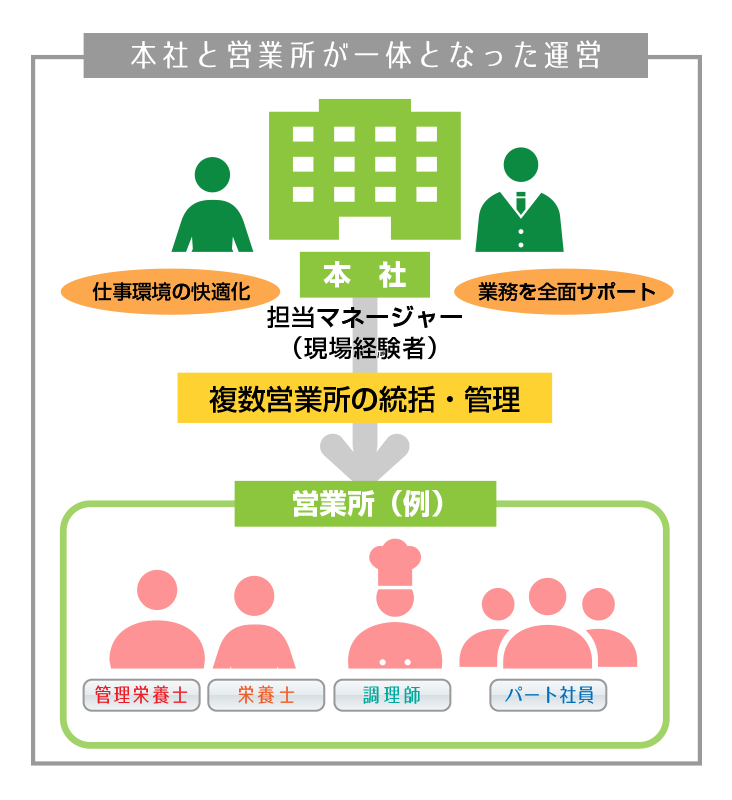 本社と営業所が一体となった運営で、業務を全面的にサポートします。営業所の統括・管理を担当するマネージャーを始め、調理指導を受け持つベテランスタッフが営業所を巡回しみなさんの仕事環境快適化に努めています。